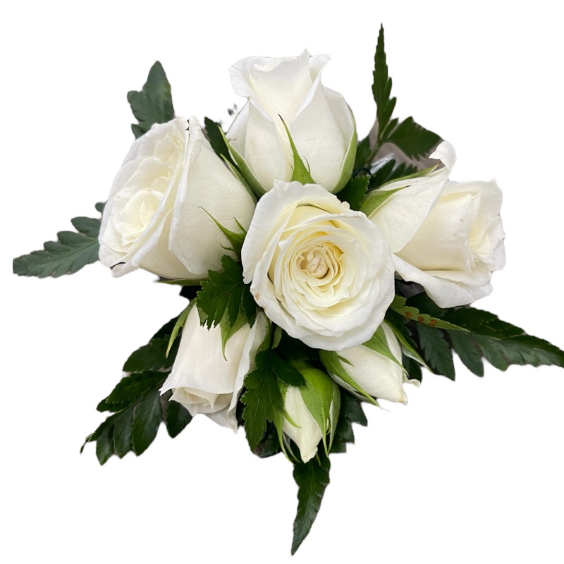 A special corsage of spray roses and delicate foliages attached to a bracelet with an organza ribbon for extra support.