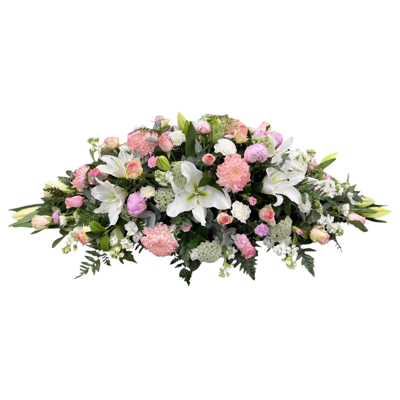 This pink and white casket spray is a florist choice seasonal casket spray. Some of the flowers in the photo provided are seasonal and may vary depending on the availability.