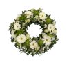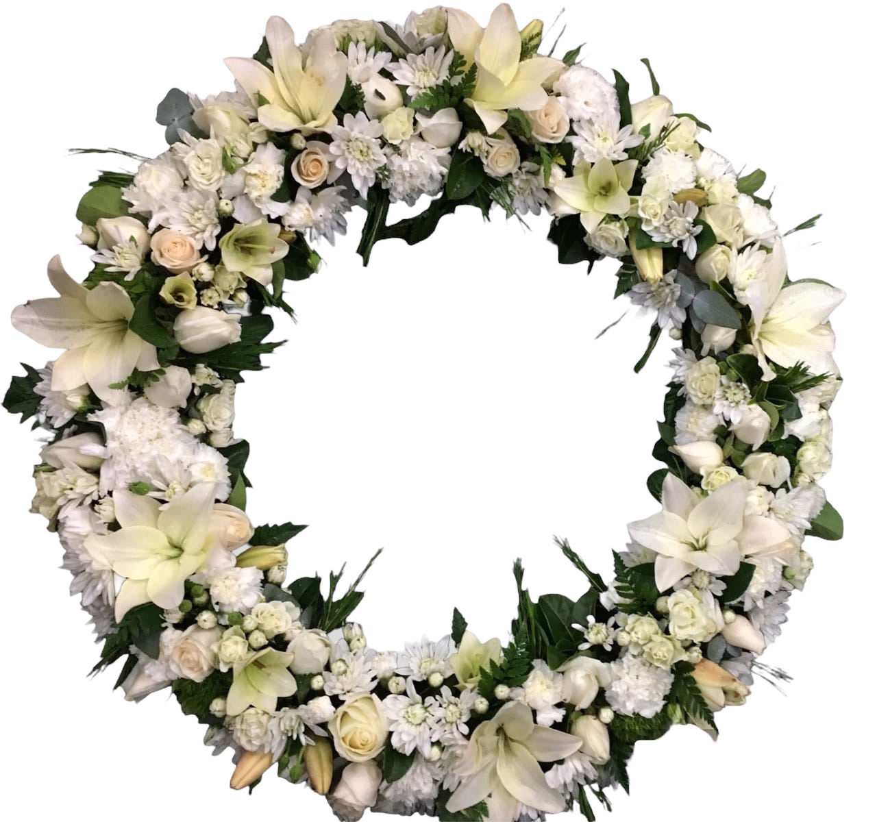 Treasured Tribute Wreath – consisting of beautiful white flowers including Roses, Lillies & Chrysanthemums.