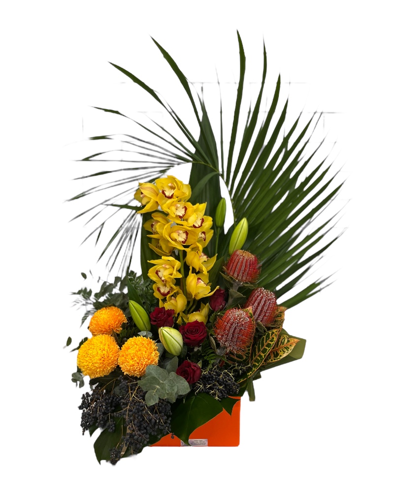 A modern vibrant tropicla Flower arrangement is sure to impress with its beauty and bright blooms. Consisting of of a variety of tropical bright flowers with tropical greenary subject to availability depending on the flowers season