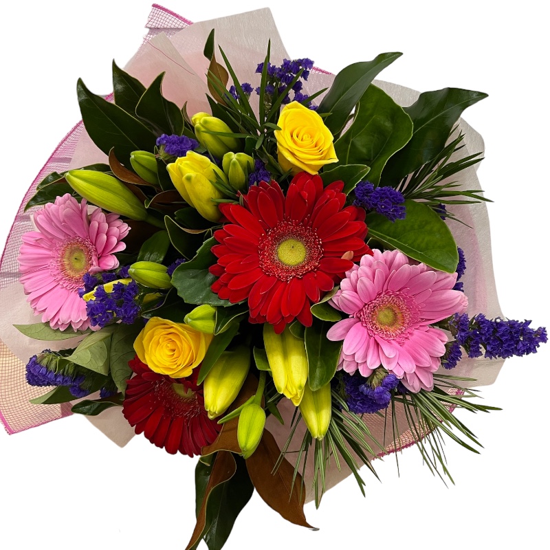 Vibrant Flower Bouquet – Brighten someone’s day with this Vibrant Bouquet of Mixed bright Colour flowers including Lillies, roses and Gerberas.